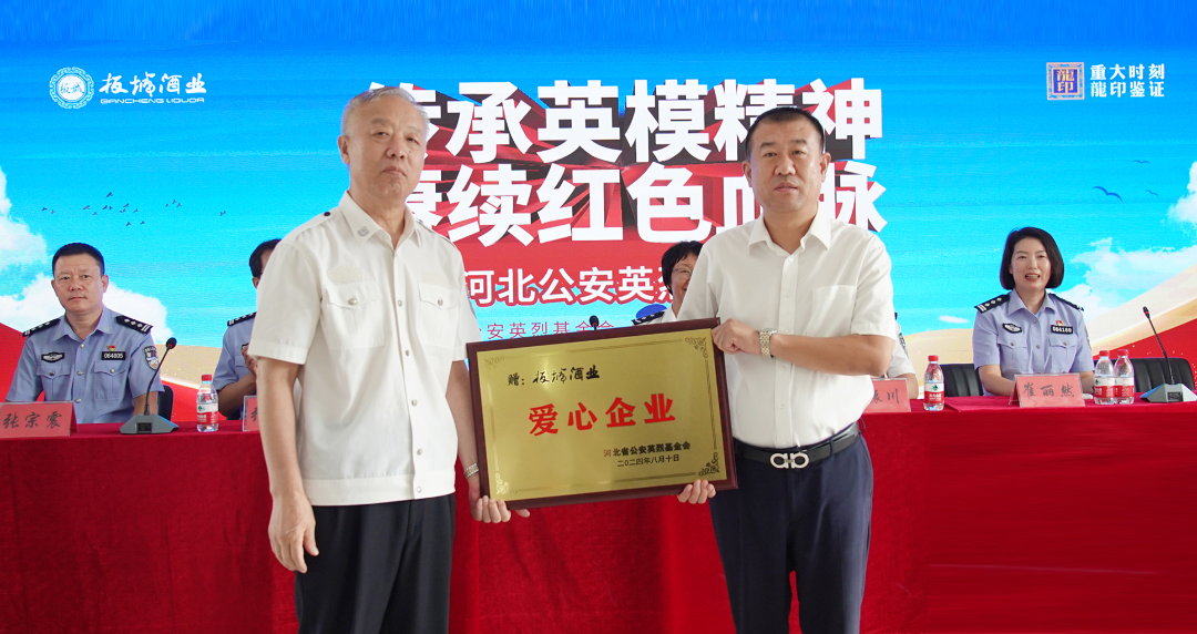 基于板城酒業(yè)積極踐行社會(huì)責(zé)任,舉辦或助力多項(xiàng)暖警公益活動(dòng),河北省公安英烈基金會(huì)理事長(zhǎng)吳鴻恩向板城酒業(yè)授牌,以感謝企業(yè)在警企共建等愛(ài)警公益事業(yè)上所做出的貢獻(xiàn)。