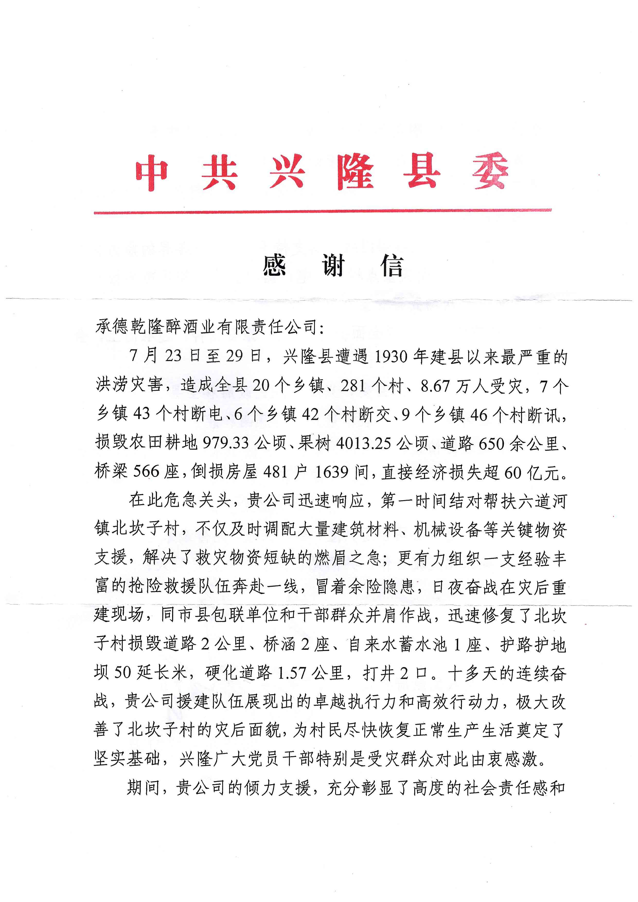 近日,板城酒業(yè)(承德乾隆醉酒業(yè)有限責(zé)任公司)收到中共興隆縣委發(fā)出的感謝信,信中對板城酒業(yè)在今年7月興隆縣特大洪澇災(zāi)害中的緊急馳援和傾力相助表示高度贊譽(yù)和衷心感謝。