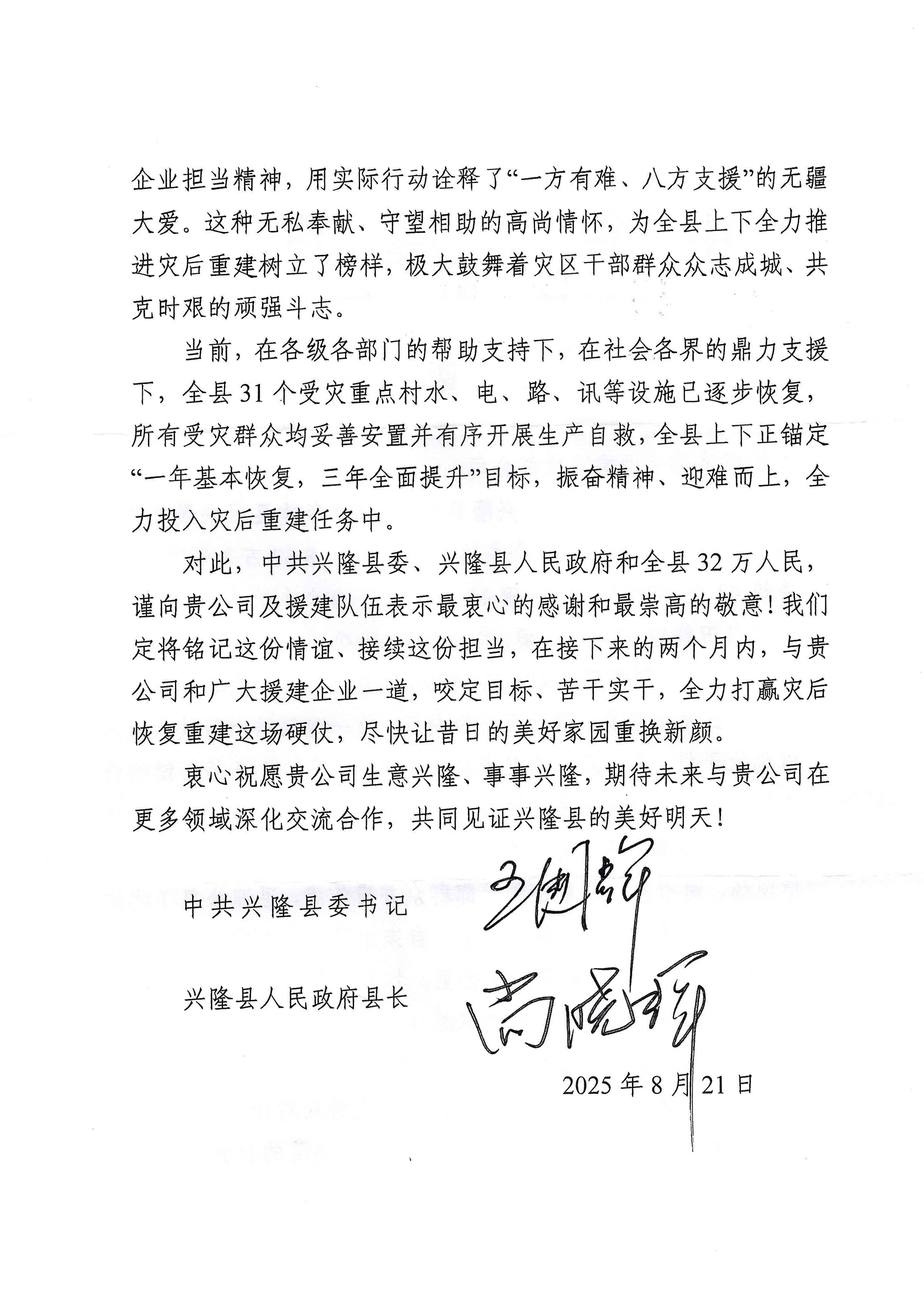 一直以來,板城酒業(yè)積極投身社會公益事業(yè),始終秉持“服務(wù)社會、回報社會”的企業(yè)宗旨。此次興隆縣的感謝信,再次體現(xiàn)了板城酒業(yè)在社會責(zé)任踐行方面的持續(xù)擔(dān)當(dāng)。未來,板城酒業(yè)將繼續(xù)秉持企業(yè)擔(dān)當(dāng)精神,在助力地方發(fā)展、參與社會公益等方面持續(xù)發(fā)力,為社會創(chuàng)造更多價值,也期待興隆縣在各方支援下早日重?zé)ㄉ鷻C(jī),共同邁向美好明天。